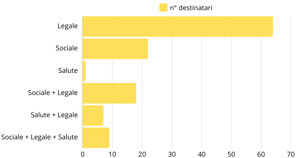 Unosportello di ascolto, orientamento ai servizi e supporto legale è stato attivato presso gli spazi del FusoLab: lo sportello ha permesso di intercettare bisogni di diverso tipo, con una prevalenza di richieste di supporto di tipo legale, sociale e socio-legale (vedi grafico 3). La complessità delle richieste e in molti casi la vulnerabilità dell’utenza ha reso evidente la necessità di un tipo di supporto prolungato, che ha permesso di far emergere in alcuni casi diversi tipi di bisogni, affrontati tramite veri e propri percorsi di supporto all’inclusione. Dei 121 destinatari raggiunti tramite lo sportello, in molti casi si sono realizzati più colloqui per un totale di 245 (come riportato nel Grafico 4). Tramite lo sportello d’ascolto si sono poi potute intercettare quelle richieste di supporto che necessitavano di una presa in carico legale di secondo livello.